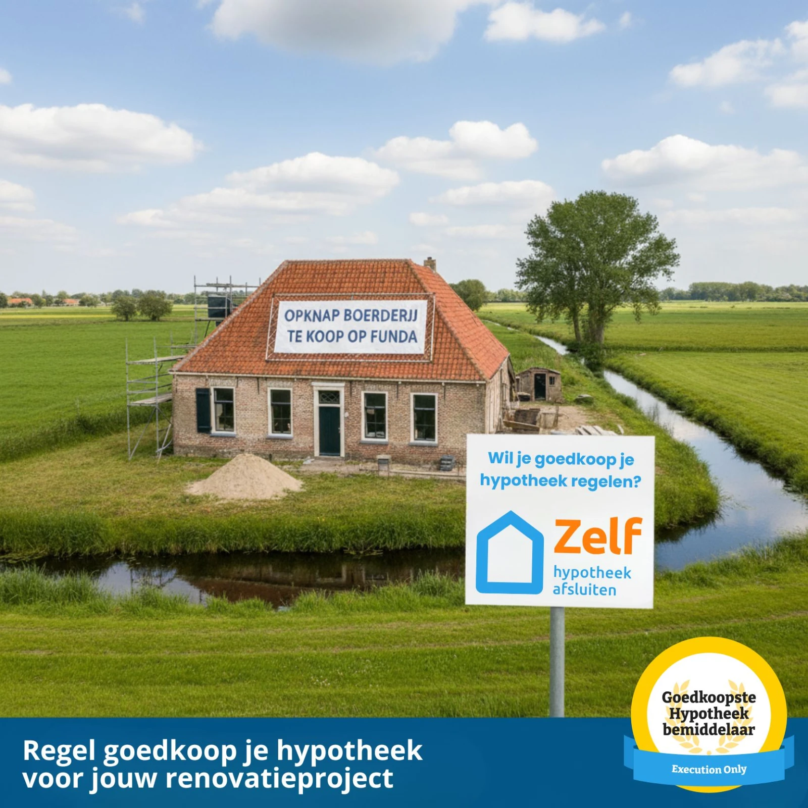 Wie een bouwval koopt om op te knappen, wil natuurlijk ook de hypotheek zo goedkoop mogelijk regelen. Dat kan bij Zelf hypotheek afsluiten™. Je kiest zelf hoeveel je wilt doen: volledig zelf regelen (het goedkoopst), met een beetje advies, of met volledig advies. In alle gevallen bespaar je flink, omdat je veel zelf kunt doen.